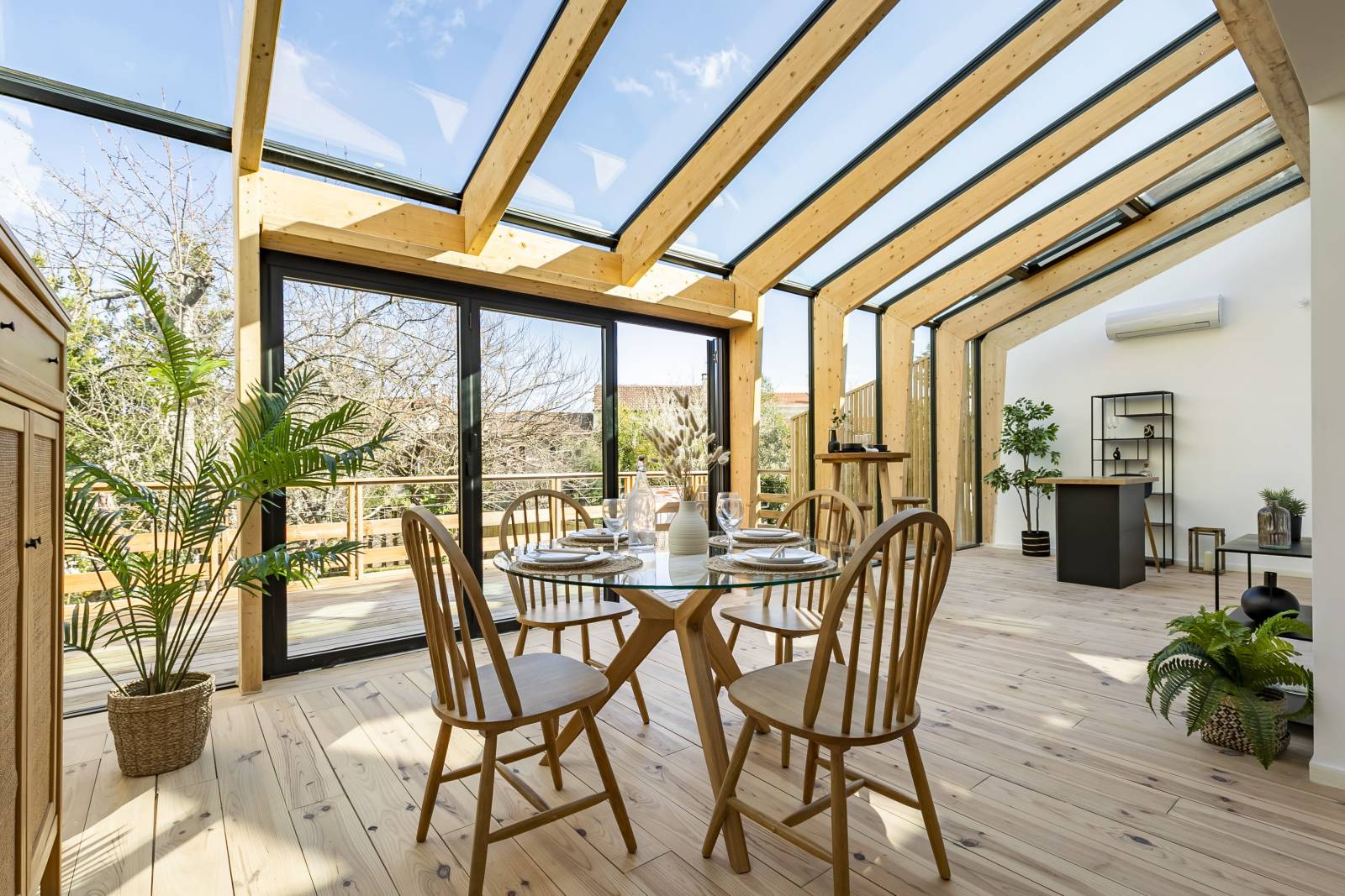 Valorisation d’un logement lumineux en rez-de-jardin avec extension vitrée, pour révéler tout son potentiel et améliorer la perception des volumes lors des visites.
